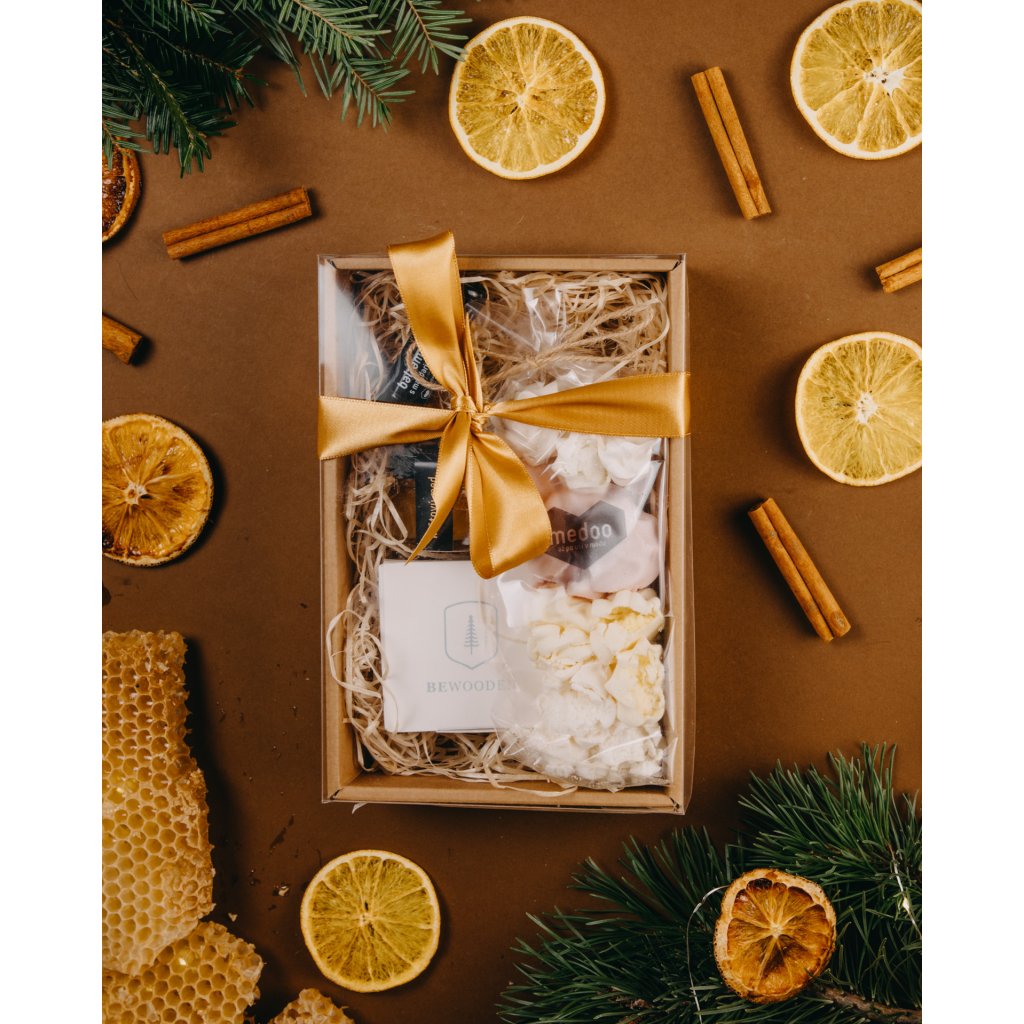 V elegantní dárkové krabici se zlatou mašlí čekají na rozbalení jednoporcový květový med (35 g), pěstící balzám na rty s medem a mandarinkami (7 ml), dřevěná brož "Včelka" jako ozdoba na blůzku nebo klopu saka a volitelně dle vašeho výběru i pytlíček medem slazených pusinek.