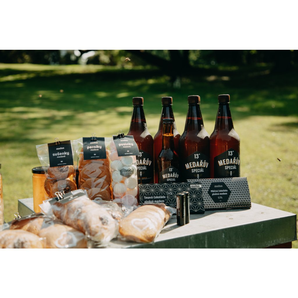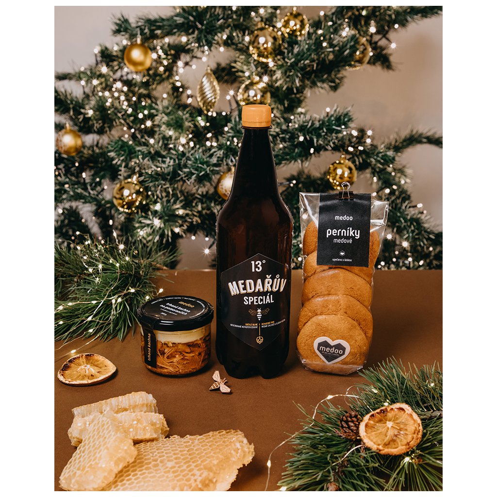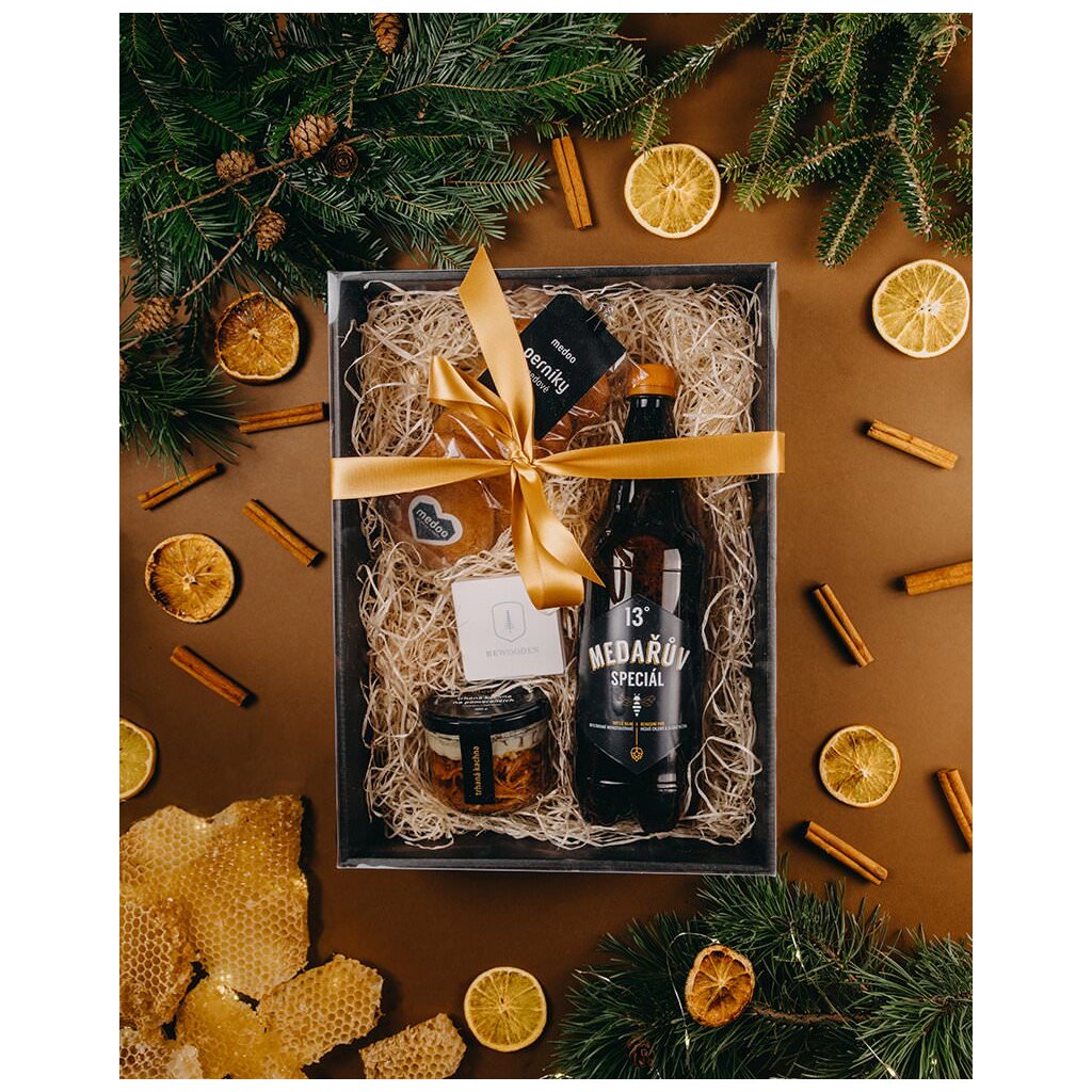 V elegantní dárkové krabici se zlatou mašlí čekají na rozbalení medové perníčky (150 g), trhaná kachna na pomerančích s medem a bylinkami (200 g), medový 13° ležák Medařův speciál a dřevěná ozdoba ve tvaru včelky do klopy saka.