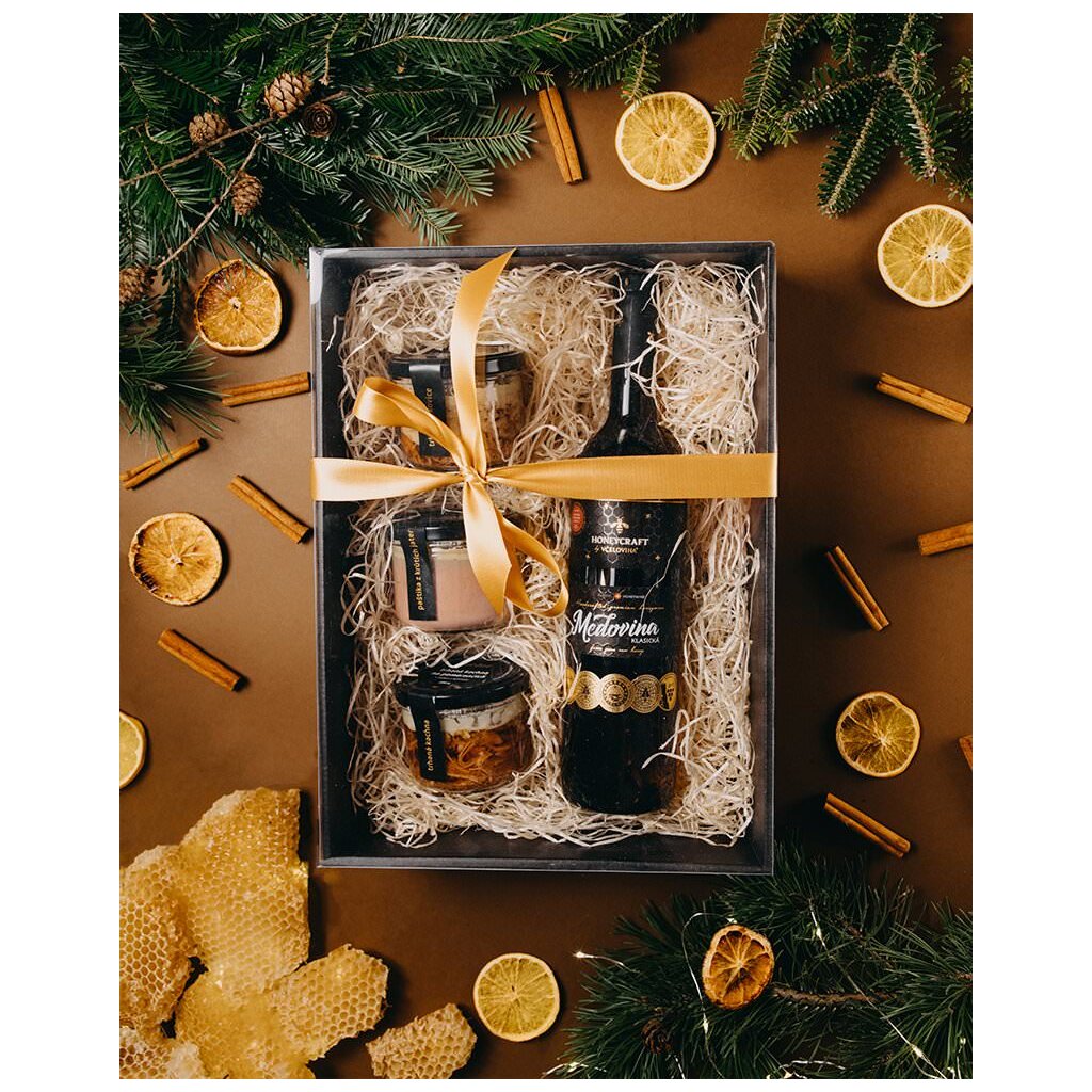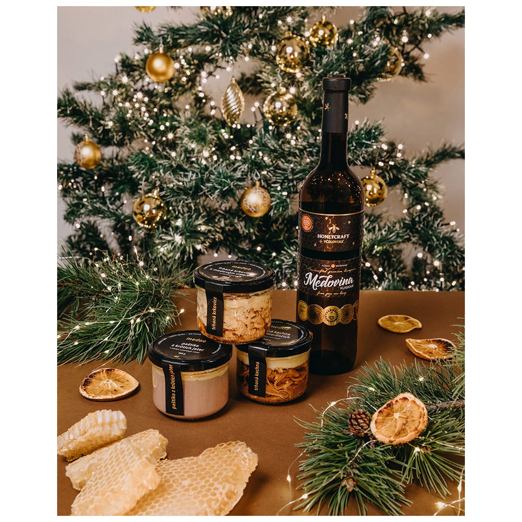 Paštiku z krůtích jater s medem a portským vínem (185 g), trhanou kachnu na pomerančích s medem a bylinkami (200 g), trhanou krkovici s medovým ciderem a zeleným pepřem (190 g) a lahev klasické medoviny (0,75 l) jsme zabalili do elegantní černé krabice a převázali zlatou mašlí, abyste se slovy “Všechno nejlepší a dobrou chuť” mohli balíček rovnou předat.