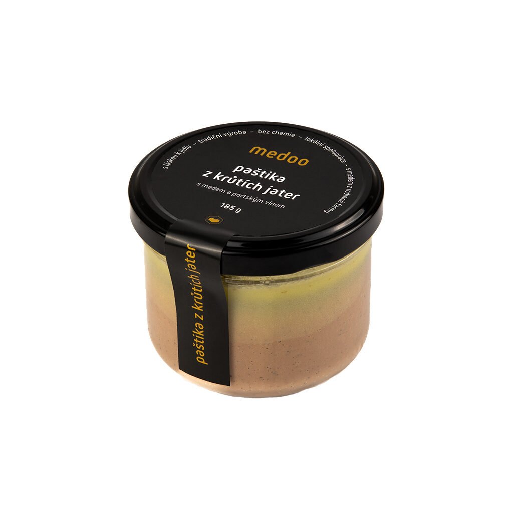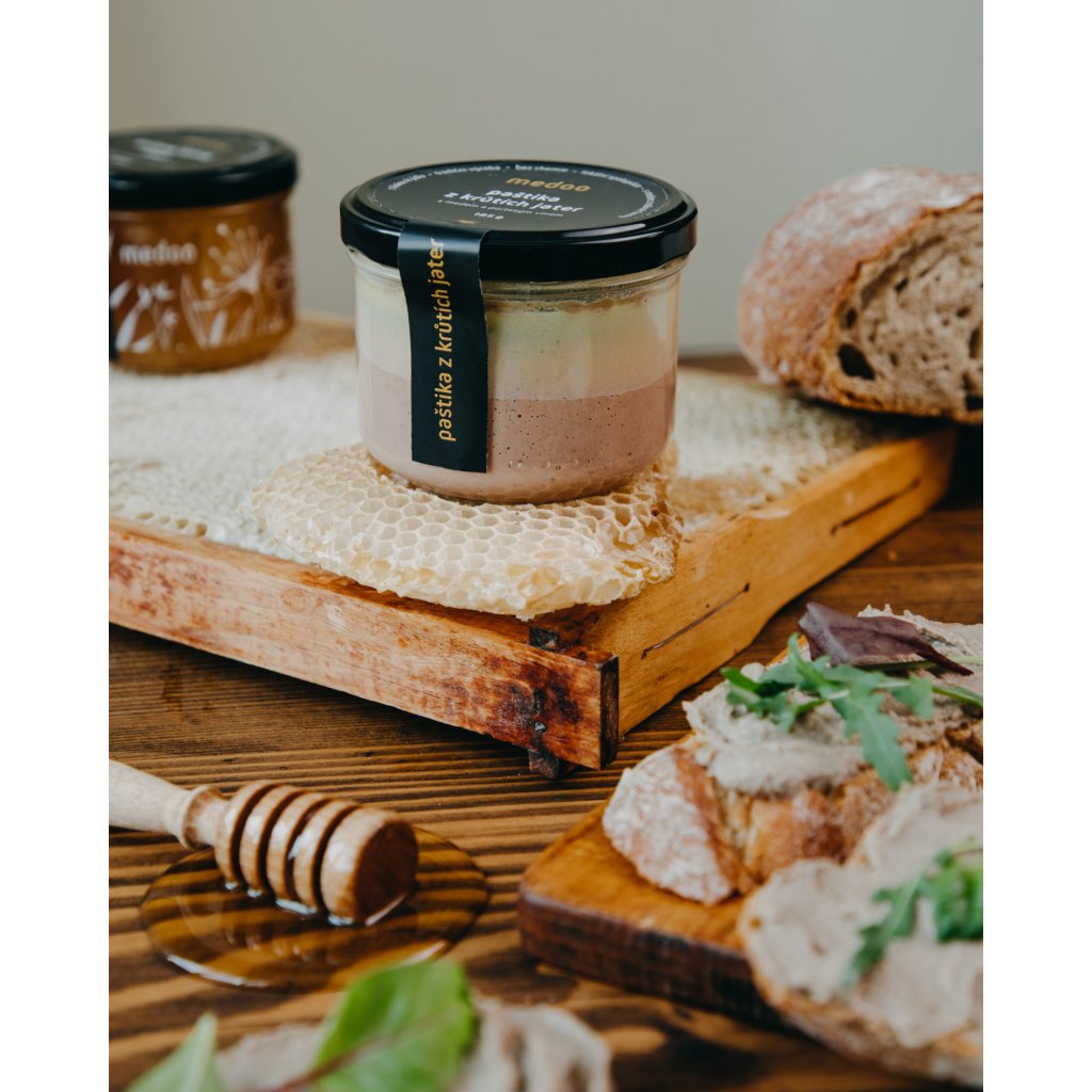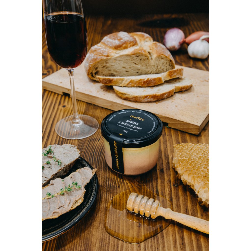 Složení: Krůtí játra, portské víno, smetana, přepuštěné máslo, šalotka, med, bylinky, mořská sůl, koření.